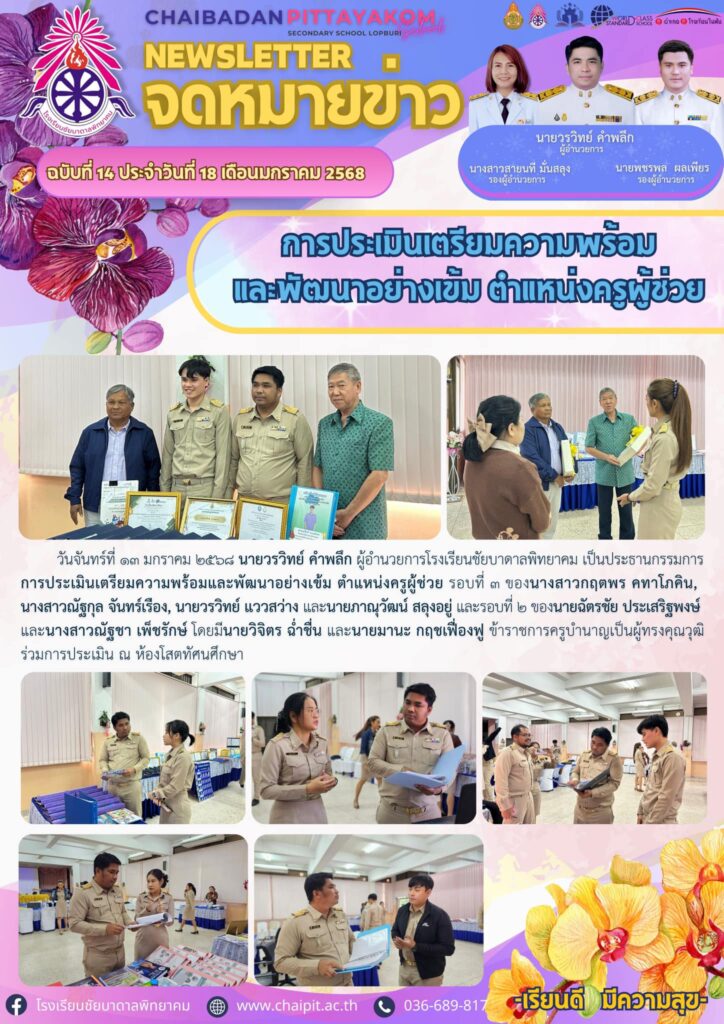 วันจันทร์ที่ ๑๓ มกราคม ๒๕๖๘ นายวรวิทย์ คำพลึก ผู้อำนวยการโรงเรียนชัยบาดาลพิทยาคม เป็นประธานกรรมการการประเมินเตรียมความพร้อมและพัฒนาอย่างเข้ม ตำแหน่งครูผู้ช่วย รอบที่ ๓ ของนางสาวกฤตพร คทาโภคิน, นางสาวณัฐกุล จันทร์เรือง, นายวรวิทย์ แววสว่าง และนายภาณุวัฒน์ สลุงอยู่ และรอบที่ ๒ ของนายฉัตรชัย ประเสริฐพงษ์ และนางสาวณัฐชา เพ็ชรักษ์ โดยมีนายวิจิตร ฉ่ำชื่น และนายมานะ กฤชเฟื่องฟู ข้าราชการครูบำนาญเป็นผู้ทรงคุณวุฒิ ร่วมการประเมิน ณ ห้องโสตทัศนศึกษา